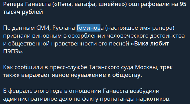 По данным СМИ, Руслана Гоминова (настоящее имя рэпера) признали виновным в оскорблении человеческого достоинства и общественной нравственности его песней «Вика любит ПЭПЭ».