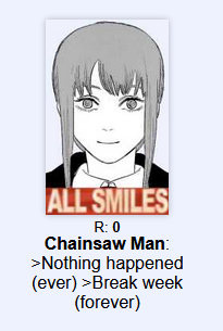 По итогу могу сказать что человек-бензопила получился довольно оригинальным гаремником старой школы, где за героем бегает влюблённый в него целибатный гарам (которых автор убивал чтобы не парится с взаимодействием персов). Тайтл тащил за счёт внезапных поворотов, интересных способностей и расчлененки. И неплохо тащил, по крайней мере в первой части и 100+ главах второй.