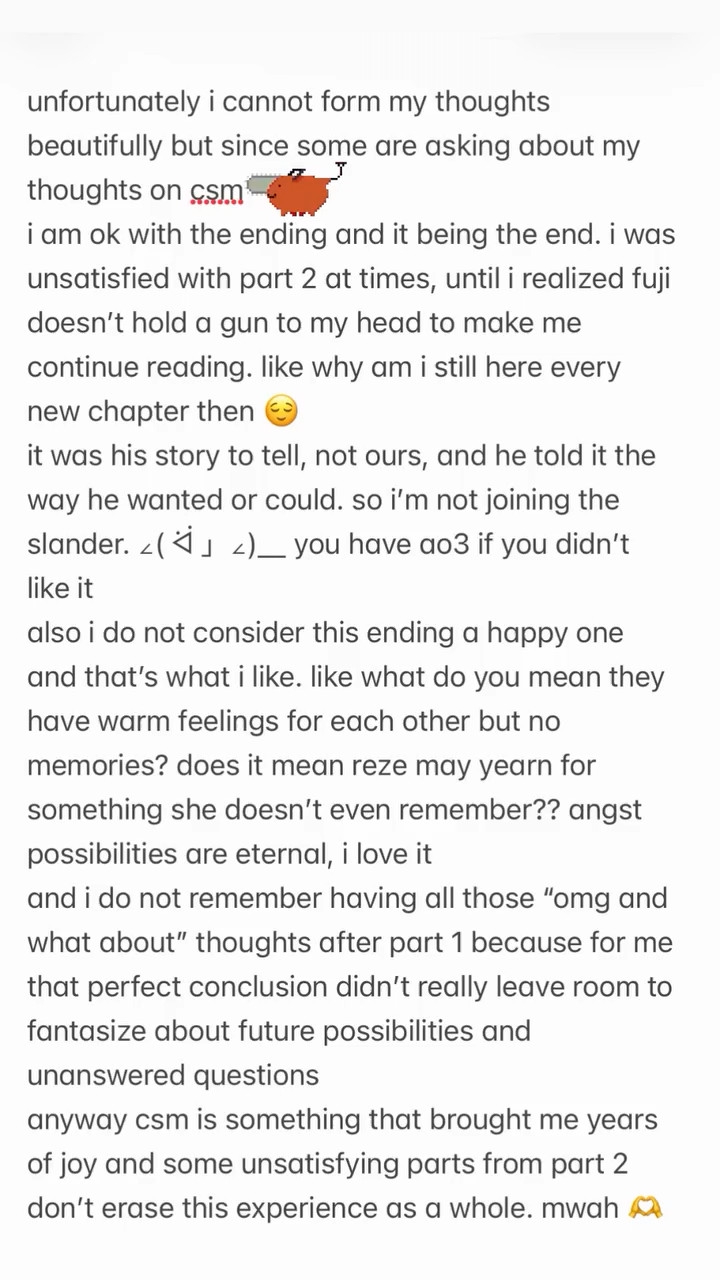 У тайтла с таким серьезным остом не может быть такого нейтрально-положительного конца. Всё закончится печально. Макима вернется, будут новые персонажи страшнее Макимы, дэн снова проебёт паву и уйдет в окончательный депрессняк, он умрет девственником, скриньте