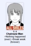 С Макимой плохо обошлись. Если бы Денджи ее не убил, пиздеца двушки не было бы, все только из-за ее отсутствия и случилось. А теперь ее вообще не существует даже после резета. Нехорошо это.