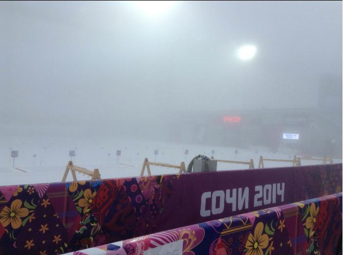 Только что передали по поводу биатлону, что официальное заявление будет в 16:00, пока ничего не ясно, но туман потихоньку начинает рассеиваться