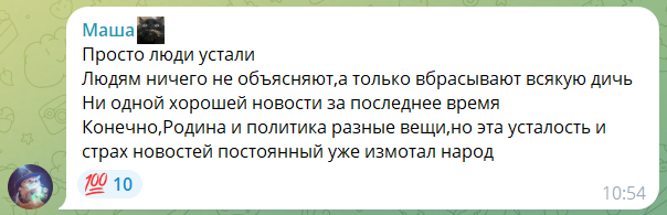 >>62277001 (OP) >Просто люди устали Людям ничего не объясняют,а только вбрасывают всякую дичь Ни одной хорошей новости за последнее время Конечно,Родина и политика разные вещи,но эта усталость и страх новостей постоянный уже измотал народ