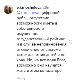 >цифровой рубль, отсутствие возможности иметь в собственоости имущество, государственный рейтинг, и в случае неповиновения отключение от системы - такое для моих детей я не хочу. Но, на все воля Бога, возможно они научатся жить в этом концлагере