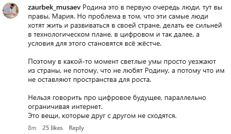 >Родина это в первую очередь люди, тут вы правы, Мария. Но проблема в том, что эти самые люди хотят жить и развиваться в своей стране, делать ее сильней в технологическом плане, в цифровом и так далее, а условия для этого становятся всё жёстче.