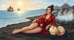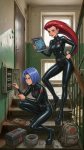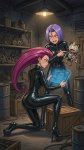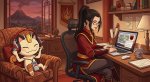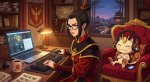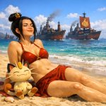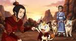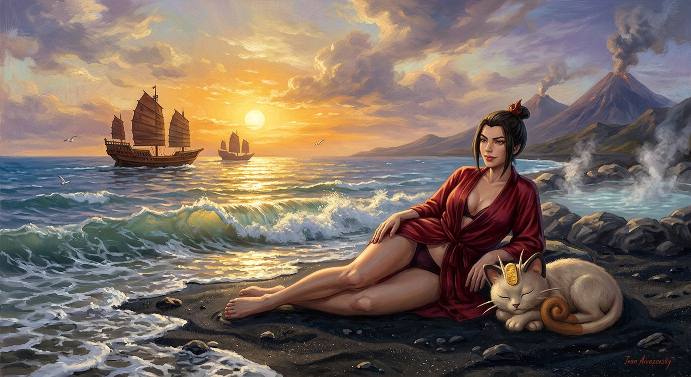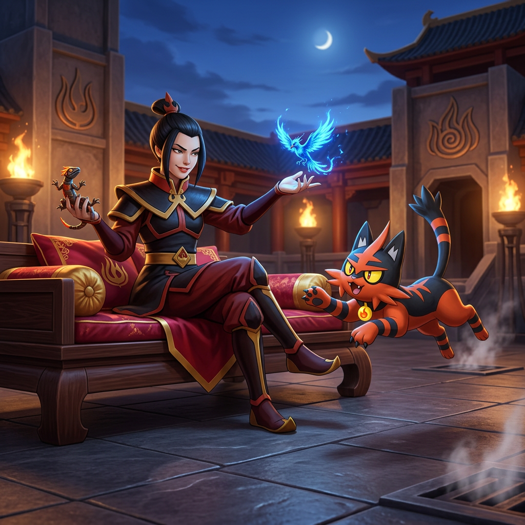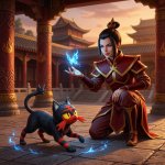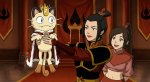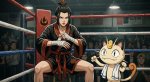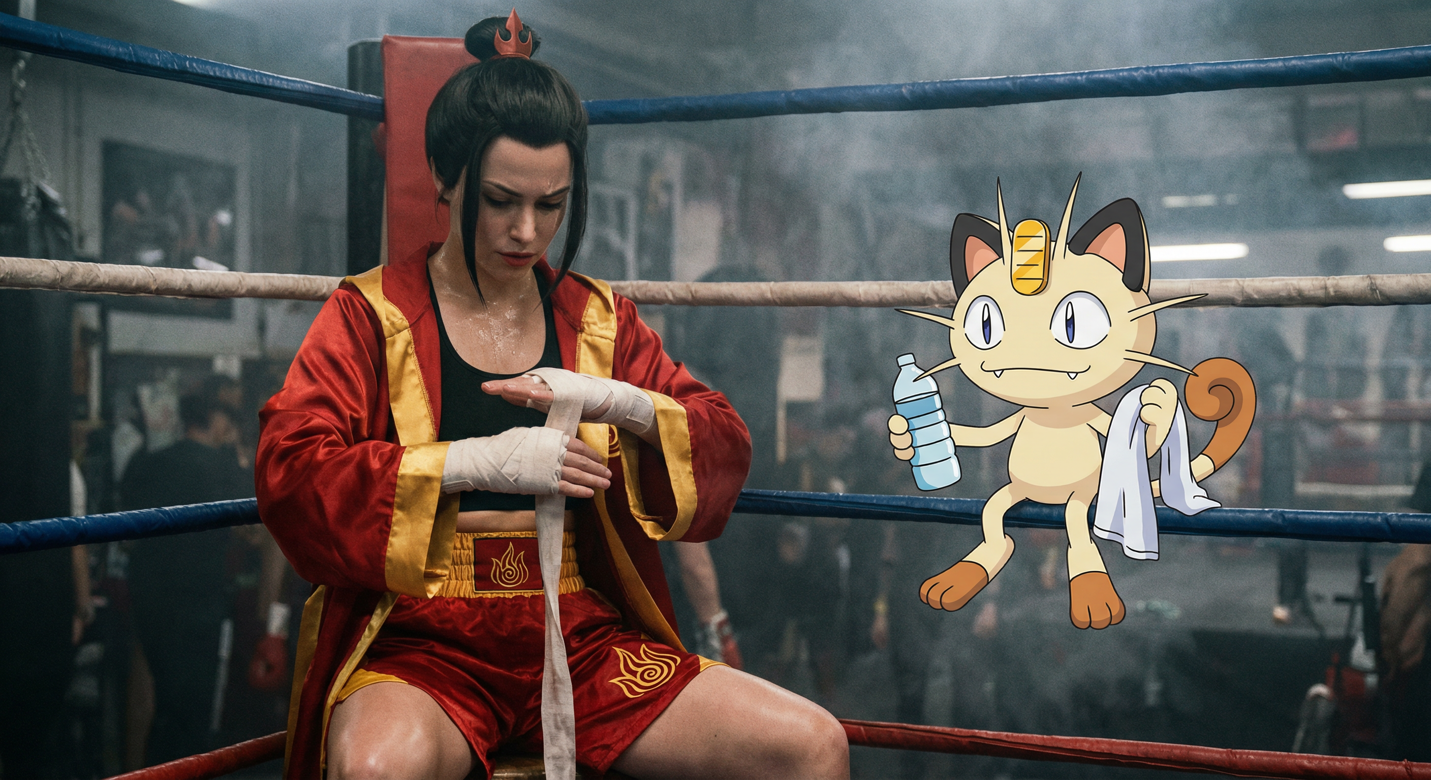 Принцесса народа огня Азула в образе боксёра готовиться к предстоящему раунду перематывая руки бинтами в одном из углов ринга, Мяут из покемонов поддерживает её рядом