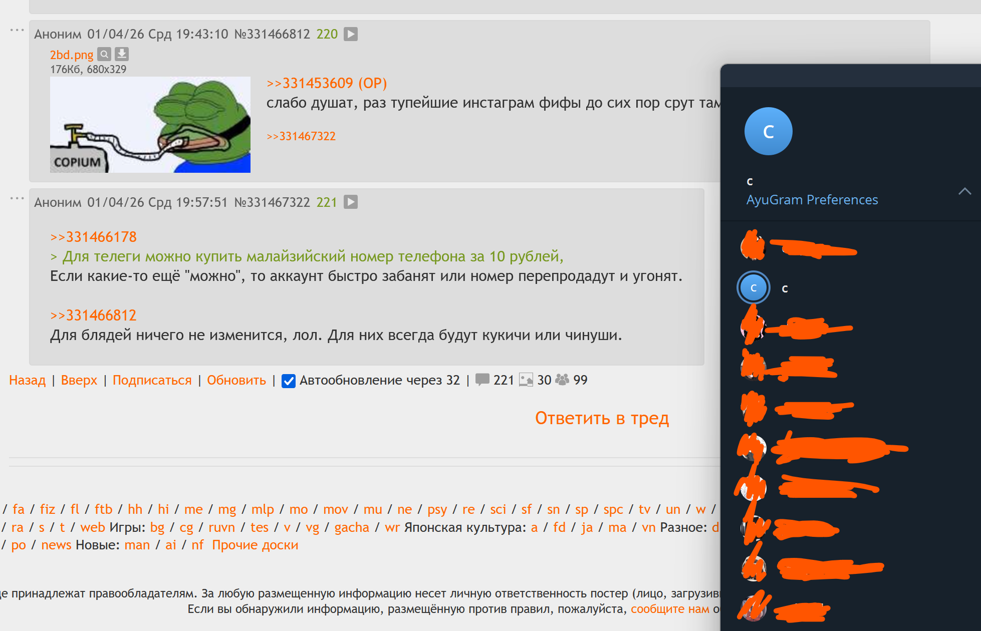 >>331466178 > Для телеги можно купить малайзийский номер телефона за 10 рублей, Если какие-то ещё "можно", то аккаунт быстро забанят или номер перепродадут и угонят.