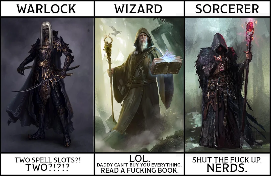 >>331444317 (OP) >недомаг, неосилятор >задрот с саентифик подходом к магии через познание >врождённый талант к магии На самом деле тут всех ебёт сорсерер, который удосужился почитать книжки. А так визард~=сорсерер >>> варлок