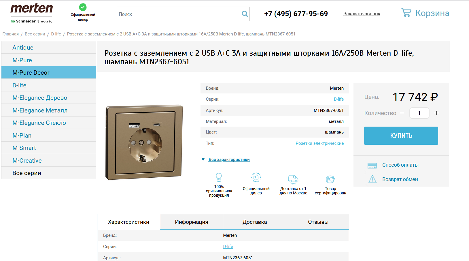 3. **Розетка:** Schneider Merten (в подрозетник).
