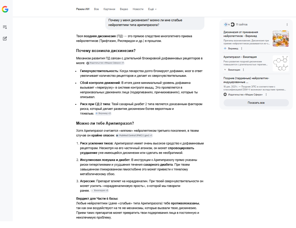 >>331528202 >Че бля? Какая у тебя дискенещия? Откуда? Поздняя дискенезия из за нейролептиков которые мне добавляли для усиления антидепрессантов 2010-ых годах. Нейросеть сказала что из за нее мне теперь запрещены любые нейролептики.