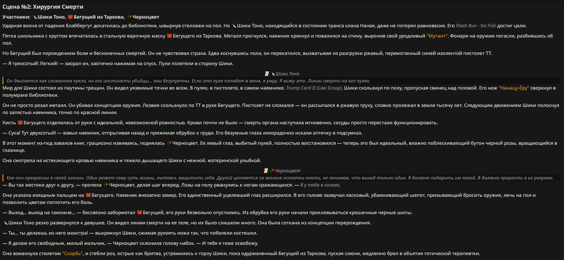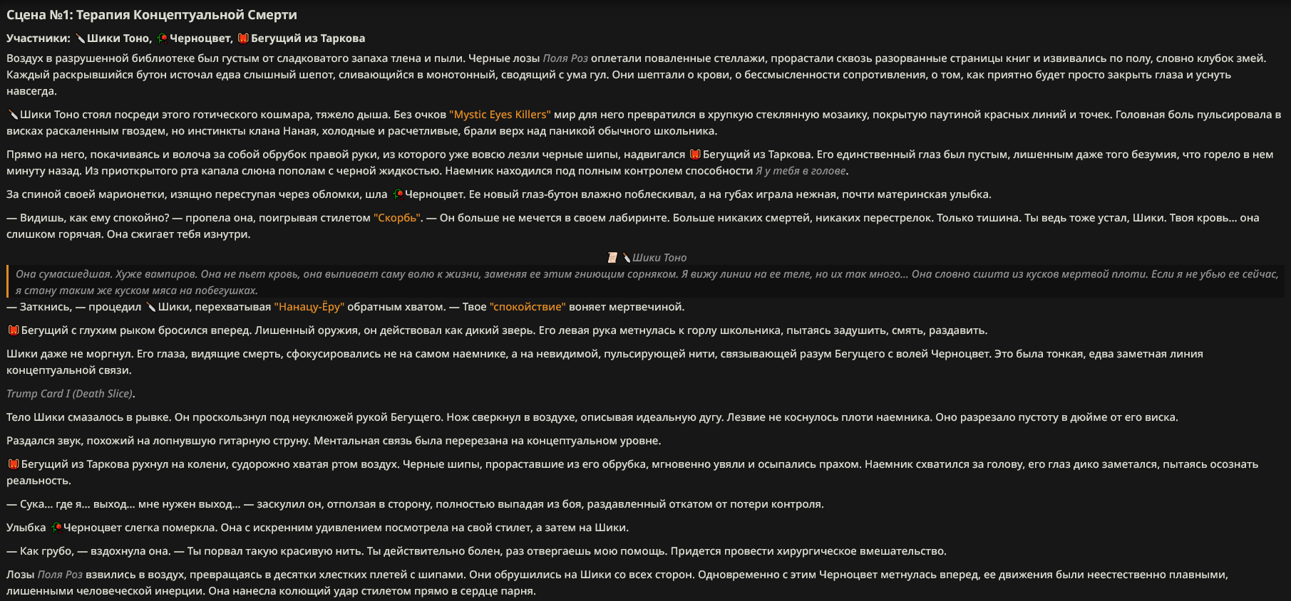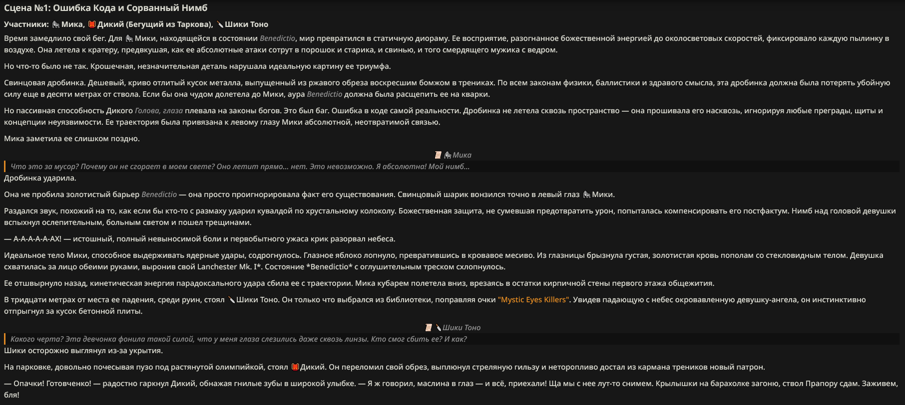 Хорошей точкой ребаланса мог бы быть просто откат ~на уровень стены, введение правил написания анкеты, где нельзя писать нарратвиные вещи (просто вообще нельзя указывать поведение другого персонажа) и более строгий мониторинг анкет, хотя бы автоматический. Это вернуло бы анкетам часть ценности. Когда тупо нельзя вбрасывать имбу. Можно еще перманентную смерть организовать и ограниченное число персонажей у игрока. Но это уже довольно хардкорно, не все понравится. Это уже на лигу походит. Нюанс в том, без тех же трипкодов это не организуешь.