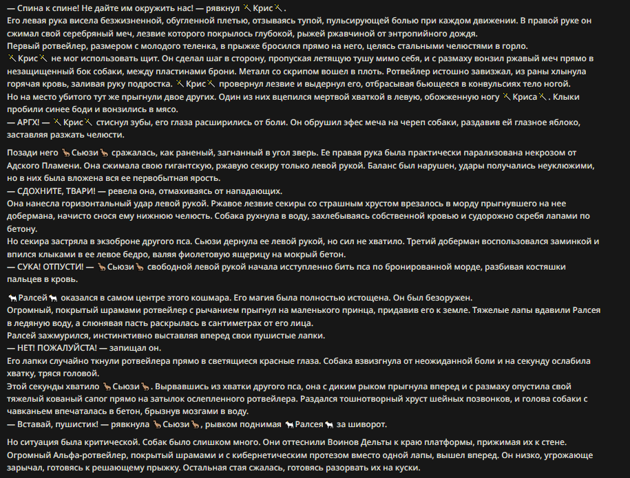 >Бле, я думал она его просто добьёт в этом раунде🥶, там же просто руку сжать и сломать шею надо было ёпт, сетап уже был, чего вдруг нейронка решила подсейвить и растянуть бой, хороший же момент для концовки стычки был >Мой Золотой Сперма делает рывок и одним ударом уничтожает галактику! — пафосно написал Куб, уже предвкушая победу. >ААААААААА! ОН МЕНЯ СЛИЛ! ФЕЕШИЗ МЕНЯ СЛИЛ! МОЮ СПЕРМУ! ВЫ ВИДЕЛИ?! ЭТО ЖЕ НАРУШЕНИЕ БАЛАНСА! ОН ОСКОРБИЛ МОЕГО ПЕРСОНАЖА! ОН ОСКОРБИЛ МЕНЯ! Бля а похоже же сук.