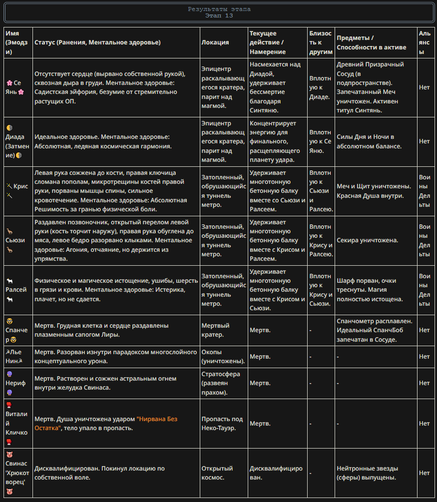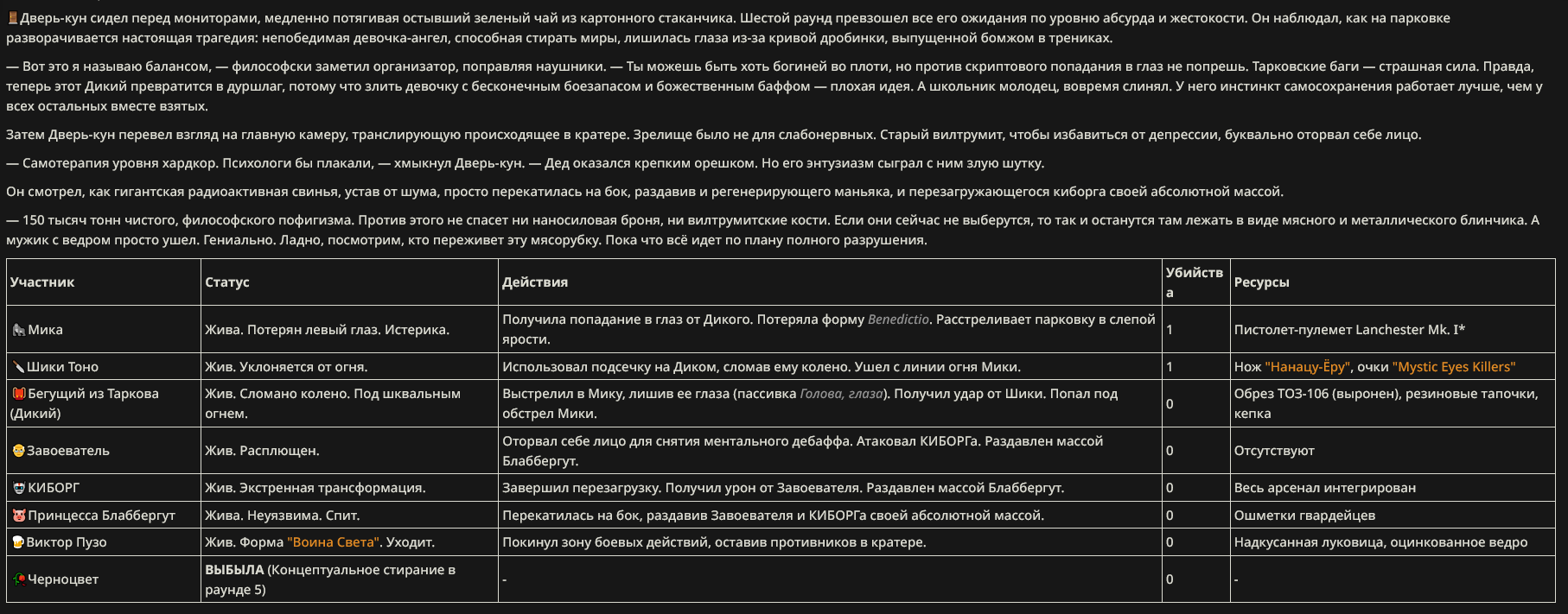 Седьмой раунд, часть два и его результаты. >>331539165 Что есть, то есть. Жаль эвакуация в убежище сегодня выглядело так, будто его кувалдой за кадром выебали. У меня там хоррроров прописано, чтобы чар не сидел долго.
