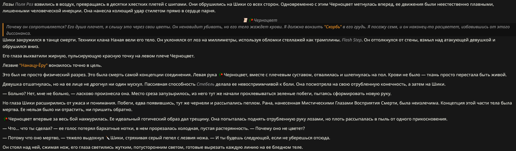 <character name="Черноцвет"> Когда-то Черноцвет была обычной девушкой с любящими родителями, но в возрасте 17ти лет она спрыгнула с крыши из за неудачной любви, но к своему удивлению не умерла совсем, а предстала перед Тем, Кто Видит, странным существом в форме двух глаз из пустоты, которое сделао ее той кто есть, наделив дающими силу татуировками. Теперь она одержима страстью спасать других людей от их собственных страхов и порочных желаний. Внешность: Худая девушка с бледной кожей и живыми татуировками по всему телу, черными волосами в которые вплетены черные розы. Одета в короткое готическое платье, подчеркивающее ее фигуру, чулки и туфельки на каблуках. Вокруг Черноцвет всегда возникает поле черных роз, которые прорастают на всех поверхностях. Имеет два оружия - длинный стилет "Скорбь" и револьвер "Надежда". Умеет мастерски ими пользоваться. Мощность оружия зависит от текущего эмоционального состояния Черноцвет и ее противника. Характер: Черноцвет ярко проявляет эмоции вроде "Бедная, зачем ты это сделаешь" и играет роль самопровозглашенного терапевта, в чем ей помогает способность безошибочно чувствовать чужое эмоциональное состояние. Черноцвет не атакует невинных и тех чьи цели она разделяет. Способности: 1) Поле Роз - вокруг Черноцвет везде прорастают черные розы, которые служат как ее органы чувств. Места где прорастают черные розы не подвержены способностям противников. Также цветы постоянно нашептывают противнику обо всем. 1) Чужими Глазами - Черноцвет может набюдать за окружающим используя органы чувств своих противников и союзников, она не получает доступа к мыслям. Радиус действия 10 км. 2) Цветок Скорби - после победы над противником Черноцвет сажает ему в грудь черную розу, которая расцветает, принимая в себя всю его сущность. Черноцвет может использовать эту розу как хочет. 3) Стебель - тело Черноцвет лишено человеческих слабостей. Она не чувствует боли и не умирает от потери частей тела. Может собирать себя из частей, присоединяя их словно саженцы или отращивая заново, включая голову. 4) Я у тебя в голове - Черноцвет может на время поселиться в голову противнику, управляя его действиями. 5) Цветочное Поле - в процессе боя с Черноцвет на теле противника в местах ранений начинают расветать цветы, которые постепенно пьют его энергию и прорастают внутрь, постепенно замещая собой его тело 6) Нектар - цветы постепенно разъедают ментальную устоойчивость противника, если у него есть хотя бы капля сомнения в своих действиях Notes: - english name "Black Blossom" </character>