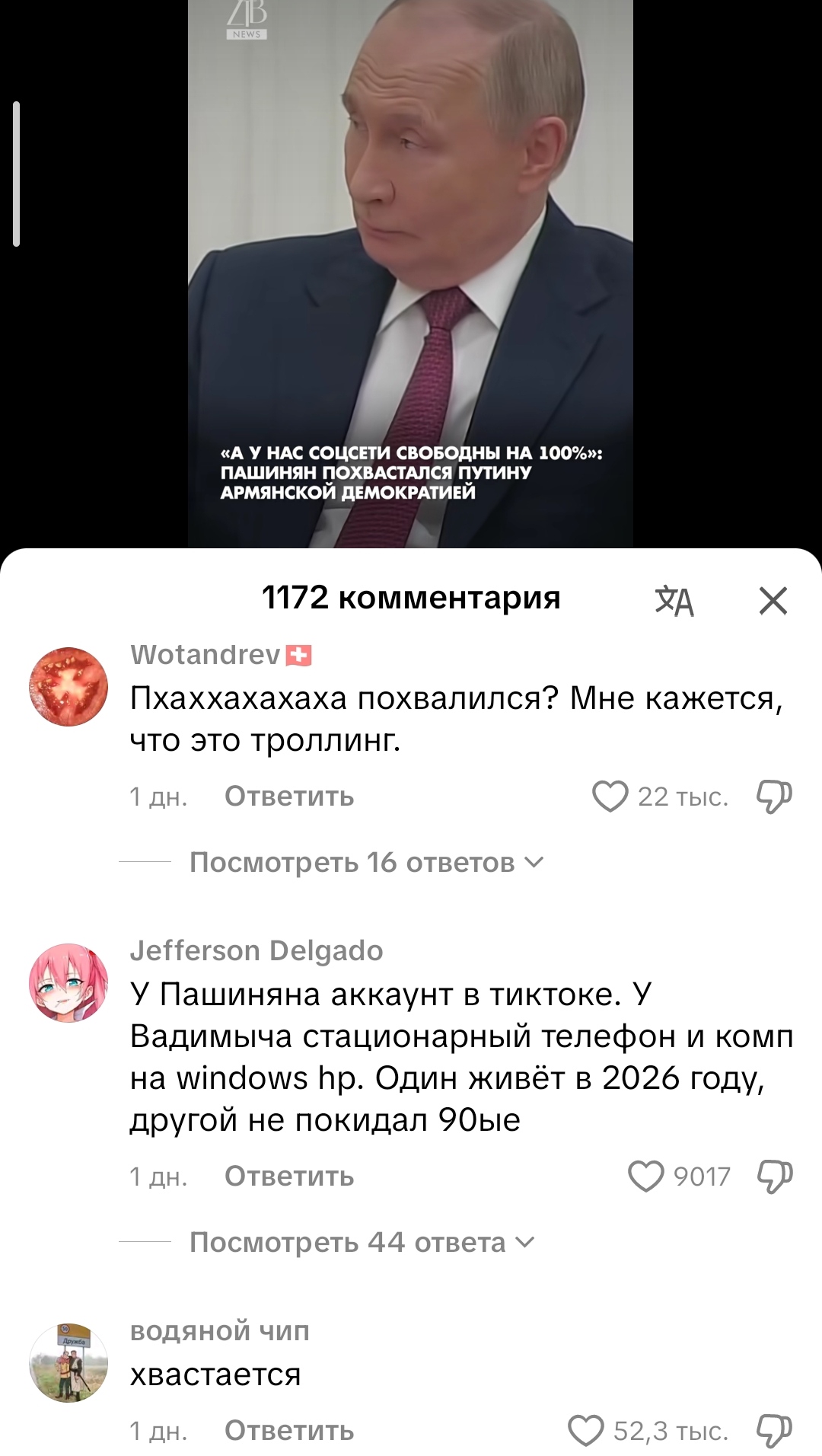 А вы думали суверенной страной на 11 часовых поясов с кучей врагов по периметру должен клован управлять? Эх молодежь, совсем не знакомы с управленческой культурой, которая формировалась столетиями. Поведение вашего Пашиняна только и кричит о том, что это несуверенная петрушка, соросятинский ставленник и тупорылый мудак уровня "блогер" (каким был, таким остался). А то, что вам это нравится и вы этим кичитесь, да еще пеняете на нашего мол "не такой же" - лишь выдаёт вас как малолетних дебилов с айсику хлебушка.