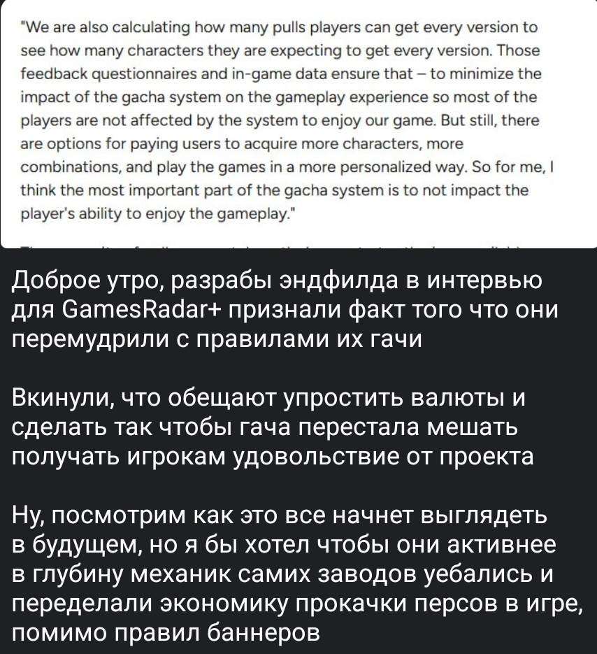 Спустя месяца два-три начнут предъявлять и ныть, мол где обещанные изменения гачи епта, хотя разраб НИХУЯ о них не сказал. И очередной отток неосиляторов искусства чтения.