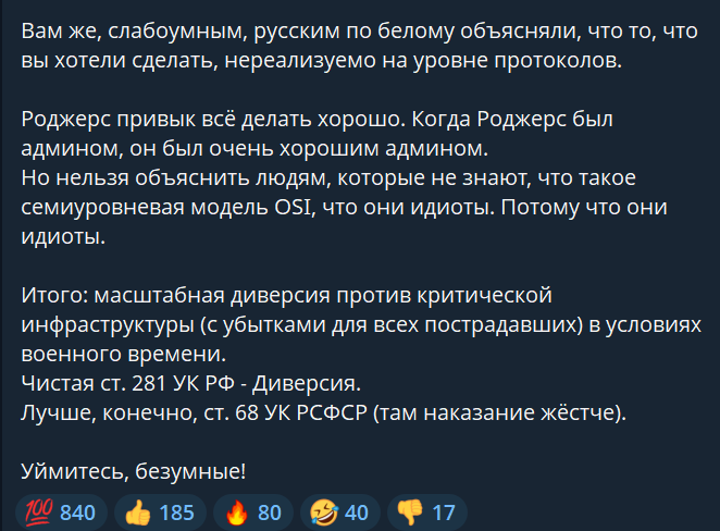 Просто представьте: чтоб по всей стране отключить интернет и обрушить сбер хохлам или нато понадобилось бы уничтожить многие тысячи обънктов высокоточным оружием за короткий промежуток времени. Но предатели из роскомпазора сделали всё сами без единого выстрела по мановению руки избавив уважаемых партнёров от необходимости тратить боеприпасы.