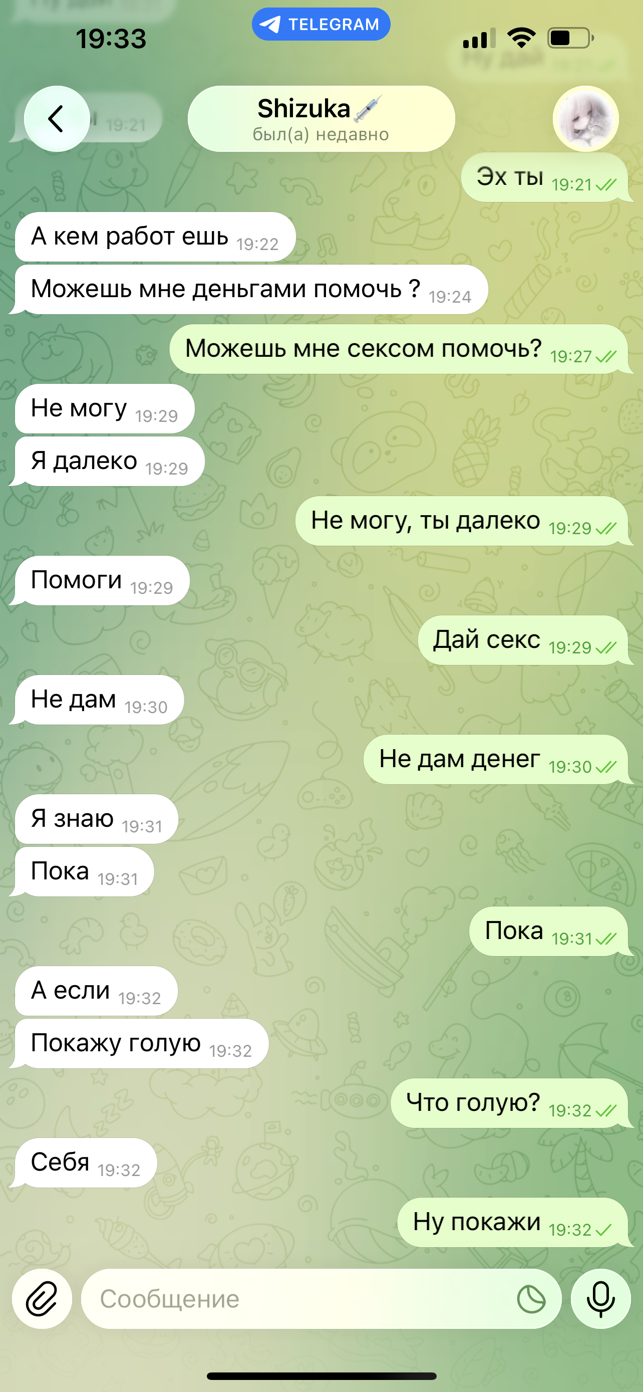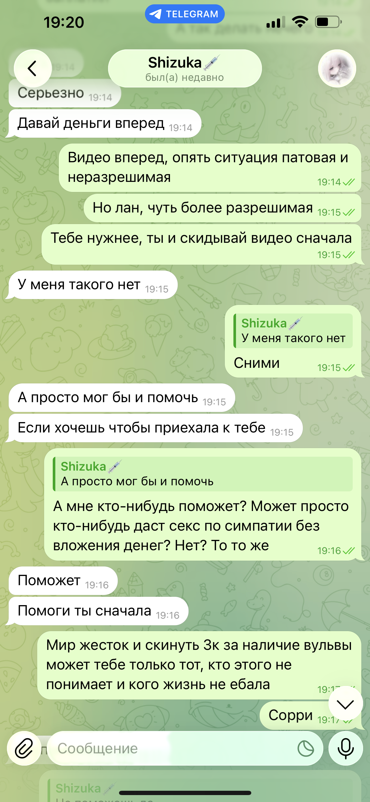 Предыстория пикрилов - списался с тян и сначала она попросила у меня деньги на билет до меня, я ей о
