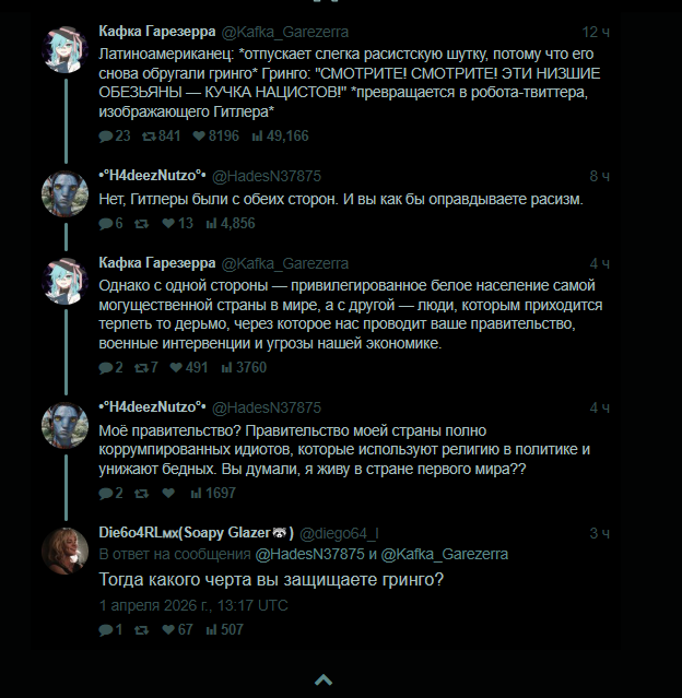 Просмотрел тред с середины которую не видел вчера и сегодня и дело такое что мексы и прочие латиносы вполне могут бузеть. Дело в том что в швитой они как бы большинство а не негры те же которым нализывают пиздец как и потенциал у них по плодячке самый большой и от испанского они не отказываются. Прицел делать на большинство это логично а вот горсточке негров что спиздили приставку с игрой или кучке трапов и трунов насасывать это сюр как есть. Форчан тоже по большей части латиносы особенно всякие игровые и аниме разделы.
