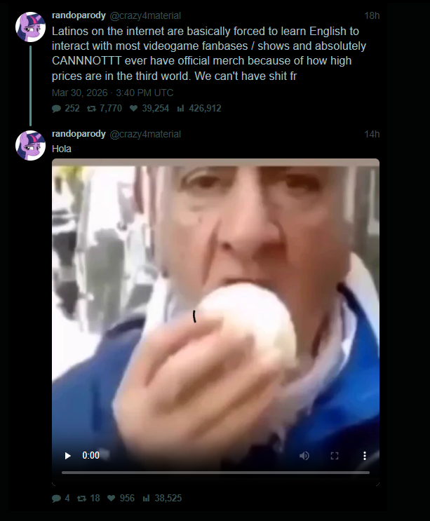 Я помню как вежливые просьбы украинцев или безрусиканипанимаю:( от русских сюда приносили как пиздец какой кринж, смеялись над скуфопереводами на которые собирают деньги а тут выясняется что бедных латиносов интернет заставляет учить англюсик. пишут это те кто англюсик уже знает и чувствует себя ущемленным >>10217339 ну да, у них там параллельная культурная битва идет с тем как много труны могут отсебятины засунуть в перевод, и видимо конкретно этот принял это не только за ущемление латиниксов, но и за камень в огород своей позиции по лохализации. >>10217375 они понимают, что тоби фокс не разработчик в привычном смысле, а буквально автор у которого есть подушка и бабла и идея которую он высирает так как хочет и когда хочет, без издателя или сроков над головой. и поэтому рякают на него они не с позиции ряяяя деньги проебешь, а ряяяя у тебя так денег дохуя хули ты нам не проплатишь лохализацию официальную расист