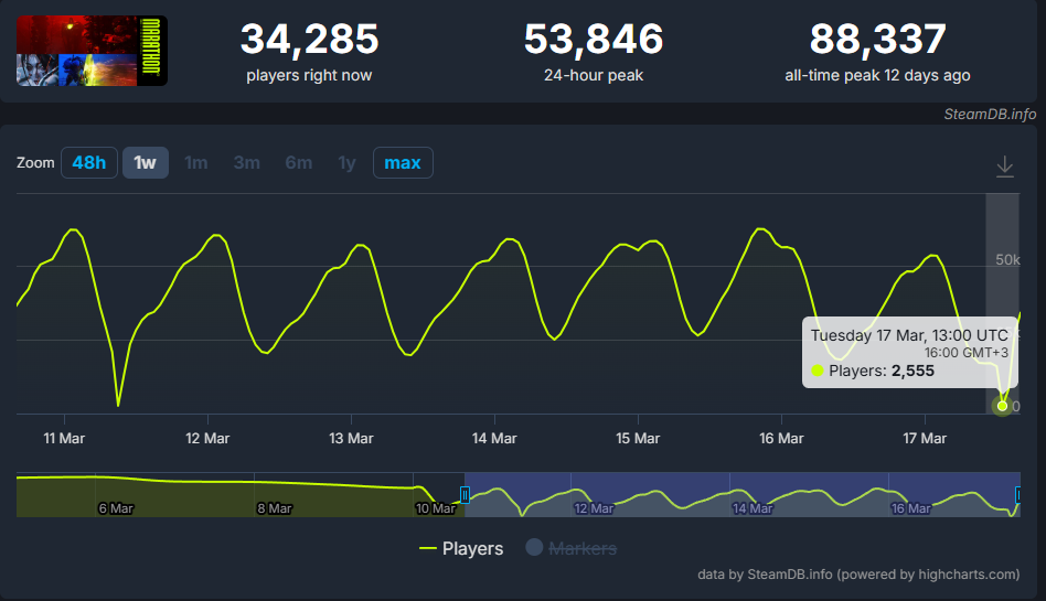 Итого, падение онлайна по минимума и максимуму на 10% за 2 дня, завтра ниже 20к будет. Если с релиза смотреть, который был неделю назад, то треть игроков ливнула. Я думаю, к 1 апреля там минимум будет 12к, а максимум тысяч 35. А после 1 июня, когда сервера вайпнут, тысяч до 5к и 12 соответственно скатится и осенью выкатят новость, что игра переводится в режим без контентной поддержки.