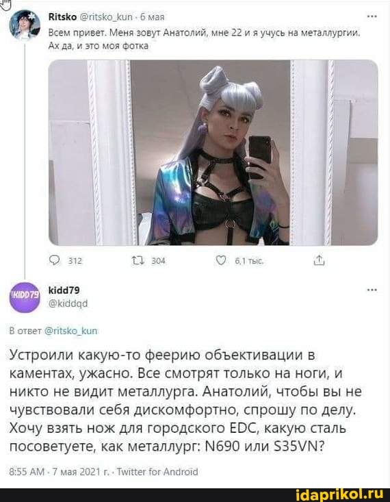 >>6707242 >>6707261 Так им это просто по кайфу, заказали себе косплей любимых персонажей и ходят в нём по улице, звездаком светят По факту эти люди живут жизнь, в отличие от нас с вами, дорогие тредовички...