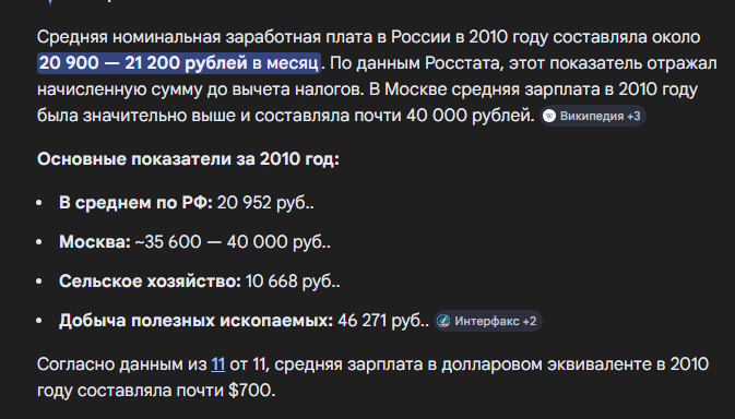 Бля, вот поясните мне откуда берутся эти свидетели сытых ХХХ годов. Всегда зряплата среднего работуна была плюс минус 1000-1500 баксов. Не важно вообще где ты работал и как. Это вот такая среднепомойная зряплатка. Что у вас за кризисы постоянно и сытые года? Я вообще никаких нахуй изменений не вижу.