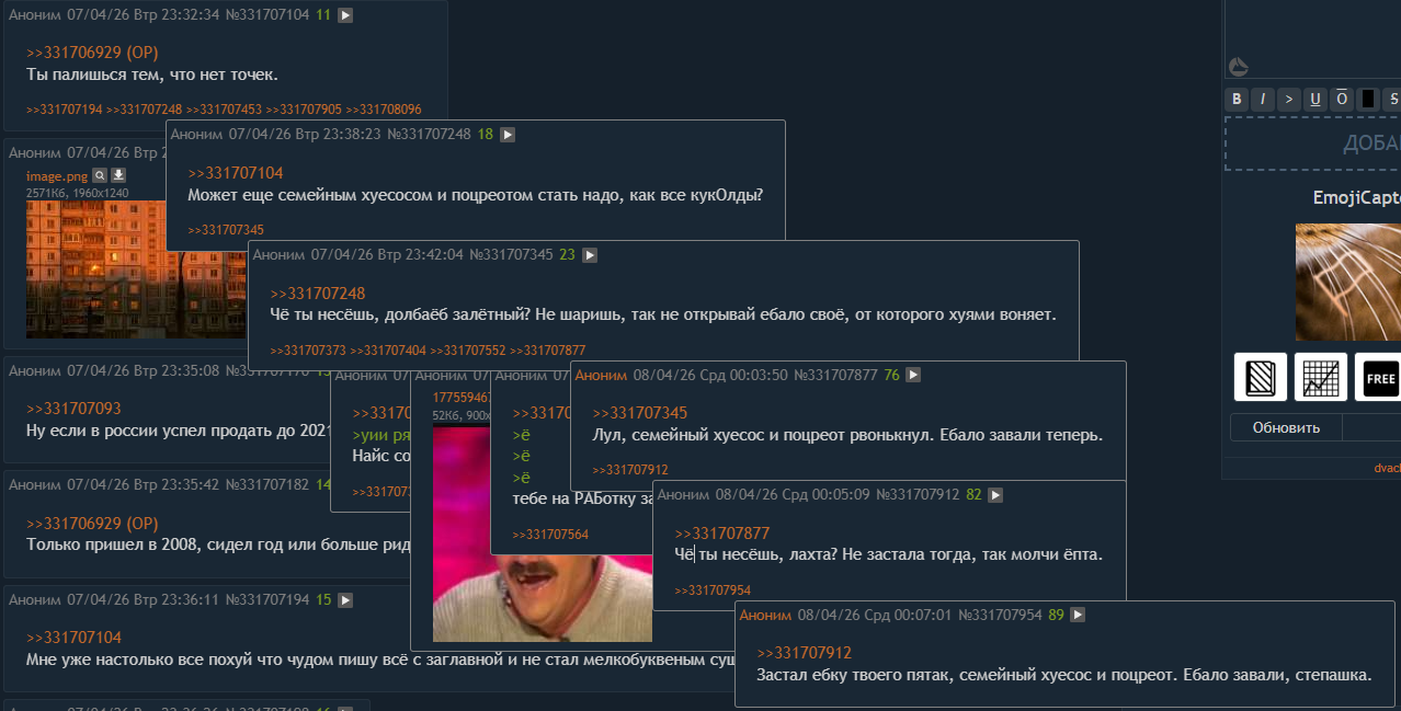 Раньше можно было постить цп, гуро, хентай, собирать личную армию для травли, а щас все очень стерильно - даже по подсети банят в /fag/, хотя я там последний раз писал еще во времена тредов про powerstation max power, то есть год 2024, если не 2023 и раньше. А виноват я. Ну что за хуйня блять?