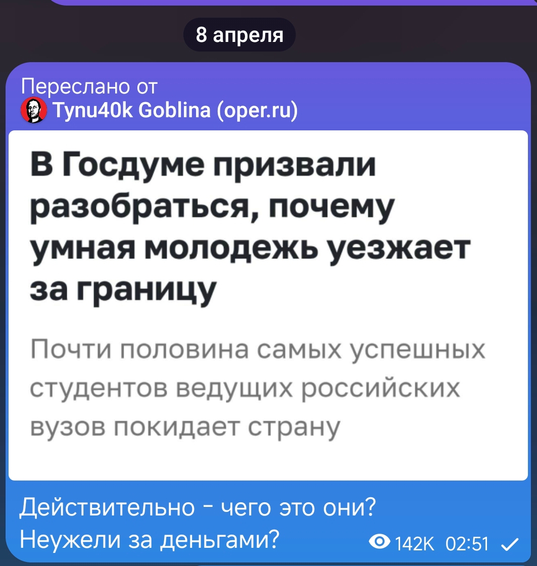 >>331706014 (OP) Ну вот я выпускник физтеха со степенью к.ф.-м.н. Когда мне предложили работу в ЕС в 2024 я взвешивал все за и против. Зарплата в РФ у меня тогда по тем меркам была не плохая. То что склонило часу весов, было то, что не приняли закон о том что кандидаты и доктора наук не подлежат могилизации и ограничения интернета. Это стало ключевыми аргументами которые склонили часу весов в пользу переезда. Ну и гонения на ученых вроде дела гиперзвуковиков тоже были аргументом.