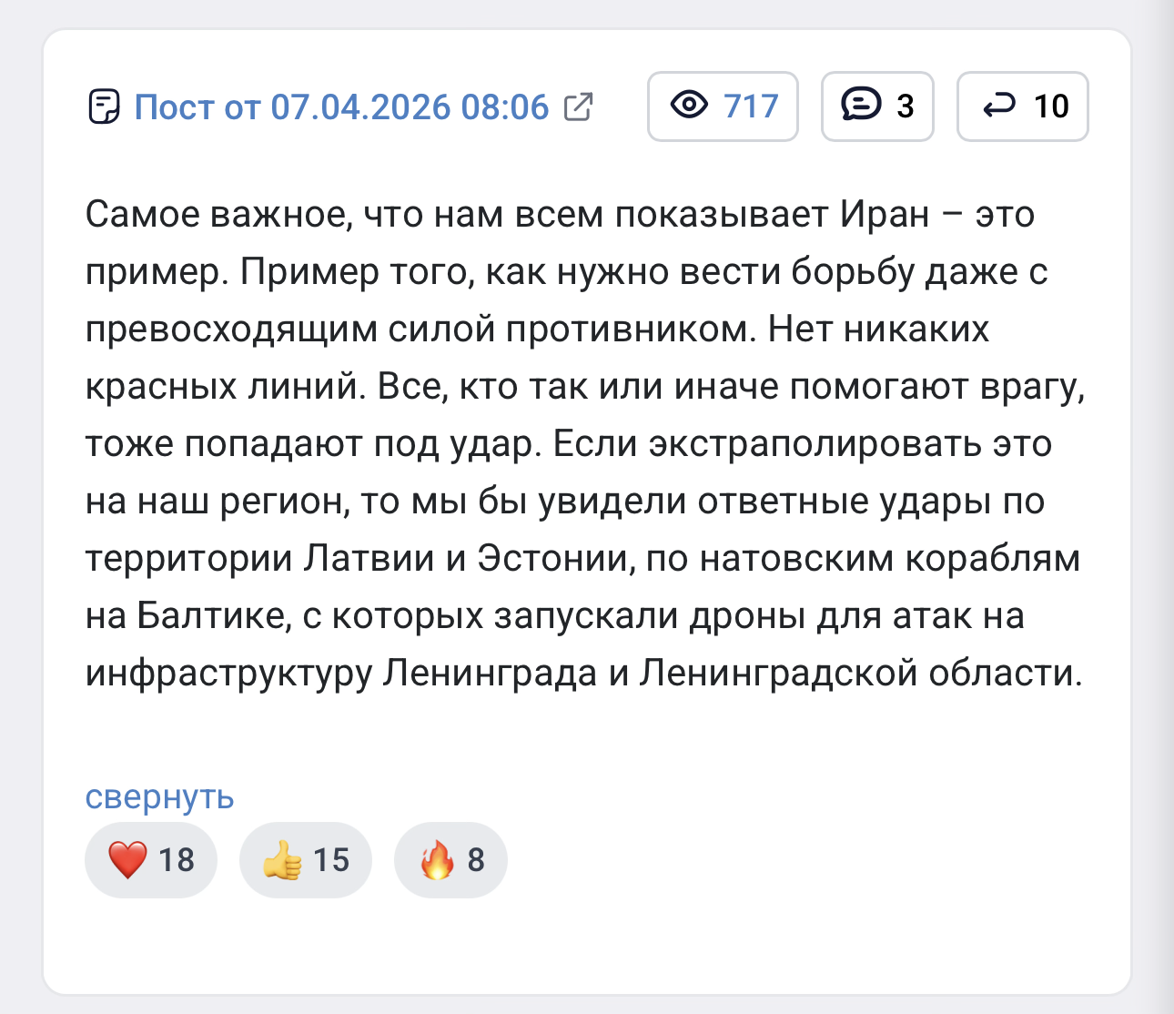 >Самое важное, что нам всем показывает Иран - это пример. Пример того, как нужно вести борьбу даже с превосходящим силой противником. Нет никаких красных линий. Все, кто так или иначе помогают врагу, тоже попадают под удар. Если экстраполировать это на наш регион, то мы бы увидели ответные удары по территории Латвии и Эстонии, по натовским кораблям на Балтике, с которых запускали дроны для атак на инфраструктуру Ленинграда и Ленинградской области.