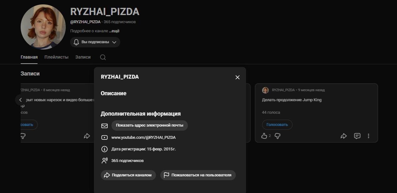 Забавный факт. Один из первых каналов с нарезками теперь выглядит так. Плюс к тому как поехавший обозленный симп рыжопича, который нарезал ее на ютуб, теперь стал хейтером и засирает на своем порванном очке мертвой стримершей, которую никто уже даж не вспоминает, пока он не прибежит