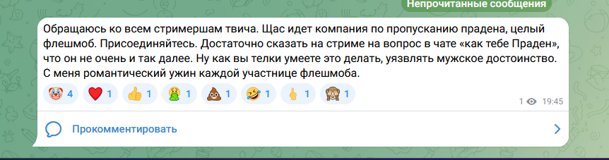 ну раз илюха попросил стримерш давить прадена, значит я буду делать наоборот любая шлюха которая выскажется плохо о прадеде - получит масс репорт с фермы за буллинг коллеги стримера без его разрешения у них там как раз пол года назад новые правила подьехали на этот счет