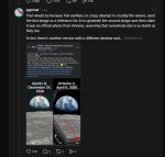 >>331733525 (OP) Отличие заговороманьки от разумного человека: Заговороманька просто поверит картинке Разумный человек проверит официальный источник Тем более на фотках не только одинаковые Земли, но и одинаковый ландшафт(точка съёмки), тогда как Артемис на Луну даже не садился, а фотография явно с поверхности.
