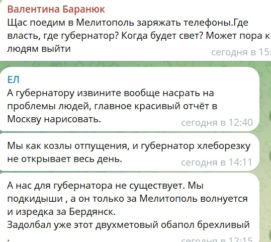 Сегодня город остался еще и без воды. Из-за отключения электричества вышло из строя оборудование предприятия «Воды Запорожья». Люди отрезаны от мира: нет возможности даже позвонить родным или вызвать скорую. Мелитопольцы жалуются, что вместе с электричеством в городе исчезают вода, связь и интернет.