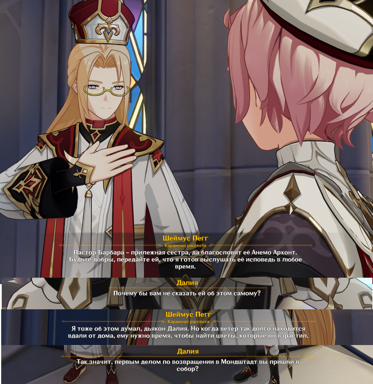 Я немного запутался в хронологии. Барбара говорит, что пошла уединиться, чтобы придумать новый гимн и случайно встретила Шилонян, спящую на дереве. На что мы указываем, что днём она спала в библиотеке... А это было когда? Это было в предновогоднем ивенте, когда забег по Горе был. Но также одновременно с этим Далия говорит о возвращении экспедиции и что Шеймус уже в городе, у кого он и будет исповедоваться на следующем слайде.