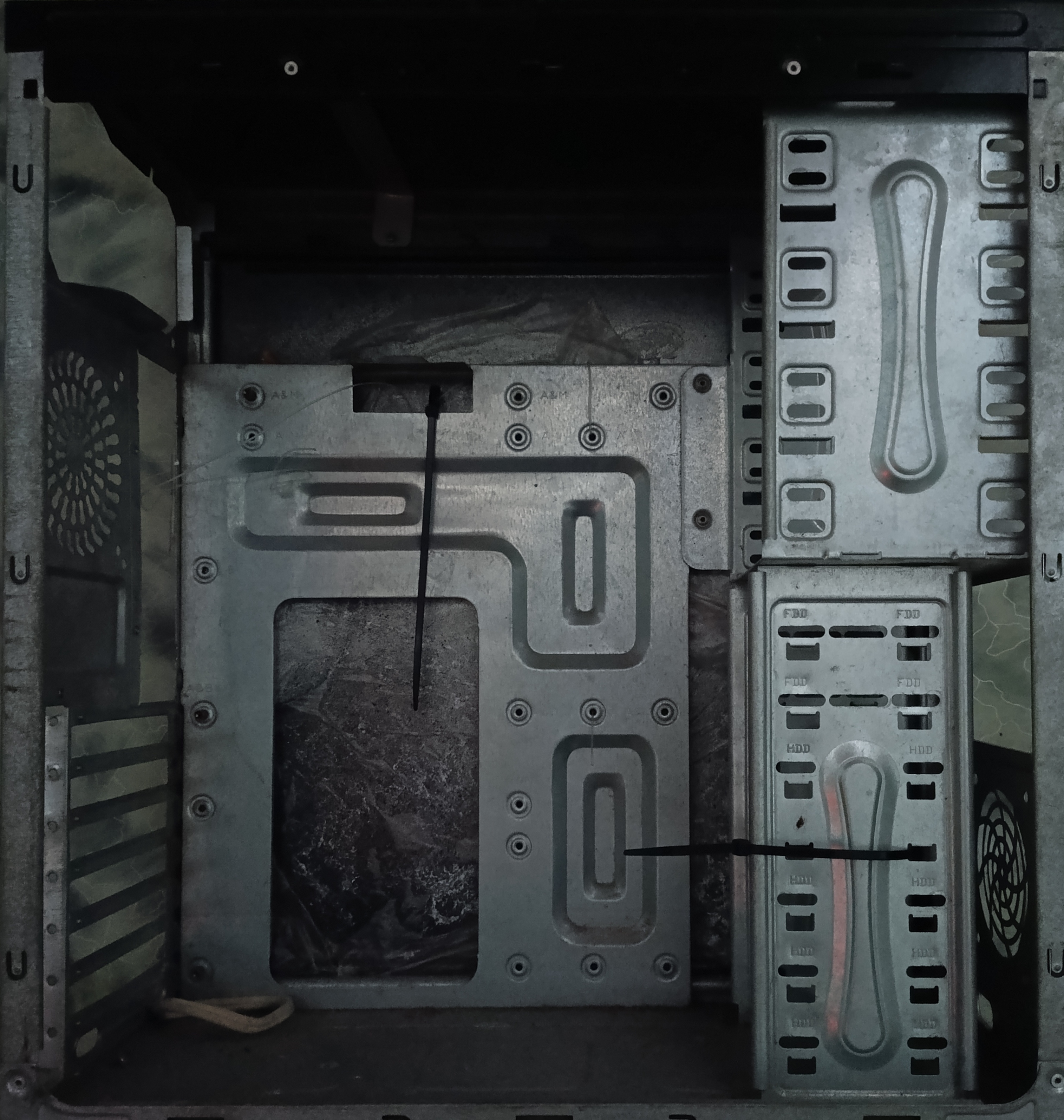 Есть ещё корпус офисный, куда всё залезет и есть салазки под 3.5 дюйма, но раздербаненная передняя панель с проводами для инициализации материнки. Отвёрткой коротить контакты в рот ебал и восстанавливать лень тупа.