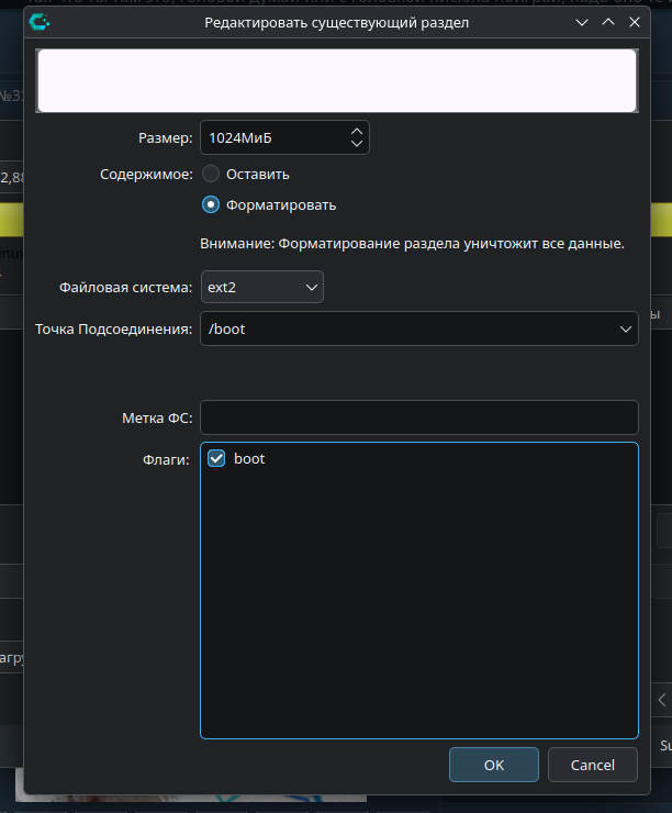 Для "/boot" - гиг-два, ext2 или fat32, обязательно флаг "boot" Корневой раздел "/" (где все системные каталоги) - 50 гигов. Если работаешь с LLM и дохуя разработчик-точик - 80-100.