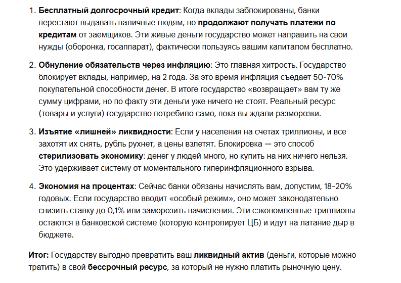 Факты: Центробанк и Минфин РФ неоднократно называли такие сценарии «бессмысленными». Экономисты указывают, что конфискация уничтожила бы банковскую систему и доверие к рублю, что нанесло бы государству гораздо больший ущерб, чем возможная выгода. На текущий момент вклады остаются основным инструментом привлечения ликвидности в банки.
