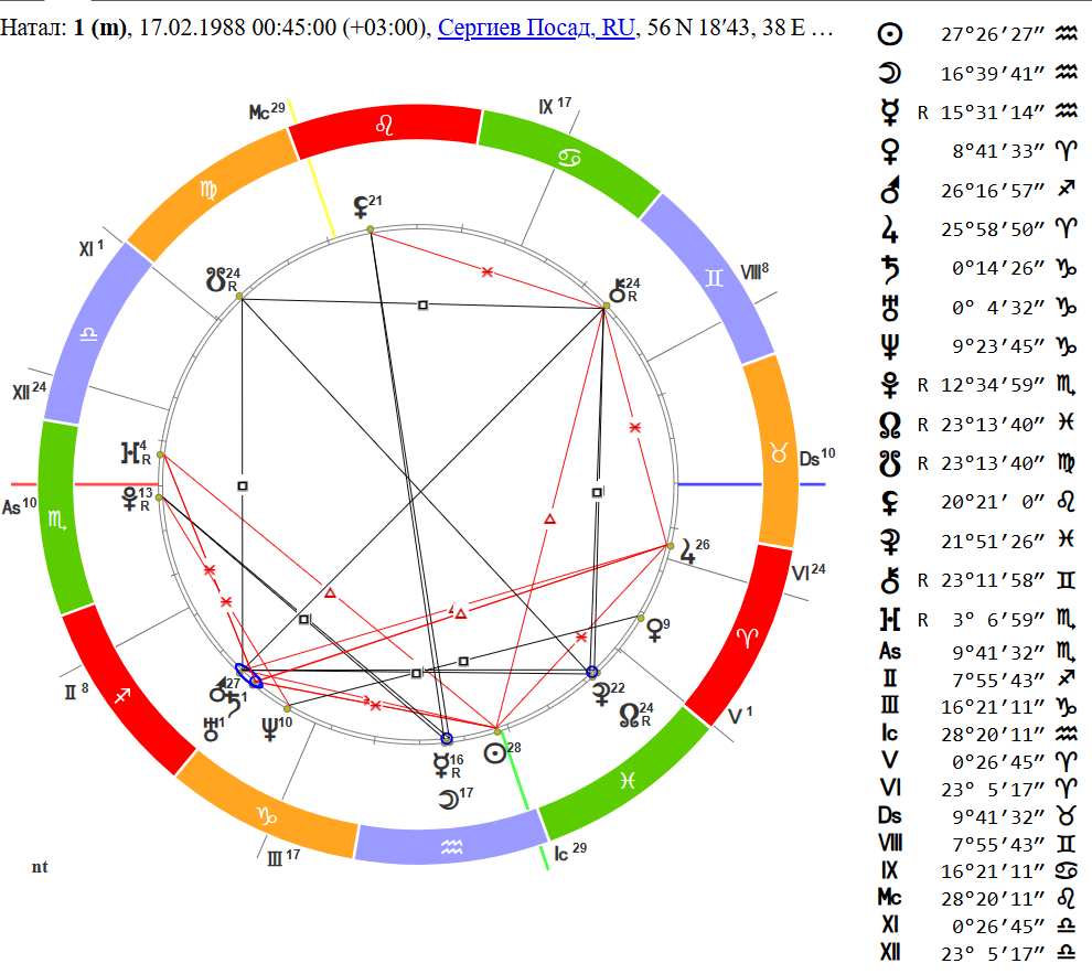 Приветствую аноны, будьте добры разберите карту. Пол мужской, время со слов матери близко к точному, на бирке при рождении стояло оно. Хотелось бы узнать расшифровку в целом, но уделить внимание стороне личных отношений и творческим способностям. Либидо сильное, девушек в жизни было много, но 90% из них если не больше это случайные, краткосрочные связи. Всё что было с серьезным подтекстом заканчивалось не в мою пользу от слова совсем, и переносил это всегда плохо. Не пойму что делаю не так, когда пытаюсь наконец-то остановить всё на одном человеке всё рушится. В плане творчества, есть кое что чем планирую заняться, но не могу никак решится, хотя периодически нахожу подтверждения того что у меня есть к этому способности, возможно даже очень сильные способности. Хотелось бы разобрать эту сферу.