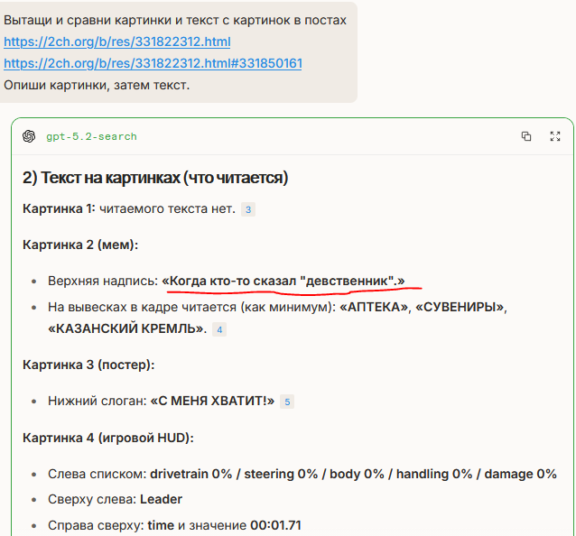 >>331850161 А вы говорите, в еральном времени не обучается, хех. Ну, теоретически, ГПТ лучшая в плане поиска, на голову опережающая и Гемини, и все остальные. У неё единственной получается находить первичные источники, когда остальные ограничиваются википедией и статьями в западной прессе. Так что то, что она может парсить двач в виде рисовалки, ничуть не удивительно. Хотя официально не задокументировано. Если ты, конечно, не пиздишь.