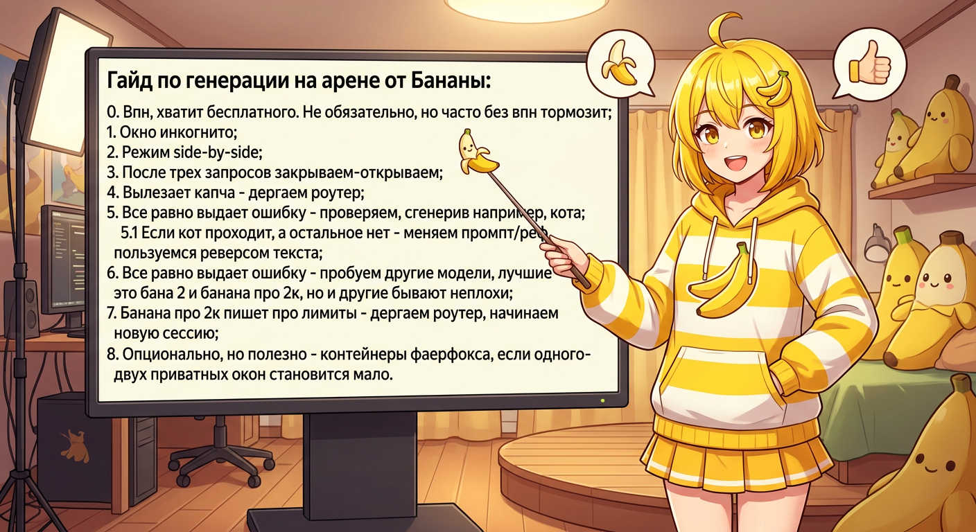 0. Впн, хватит бесплатного. Не обязательно, но часто без впн тормозит 1. Окно инкогнито 2. Режим side-by-side 3. После трех запросов закрываем-открываем 4. Вылезает капча - дергаем роутер 5. Все равно выдает ошибку - проверяем, сгенерив например, кота 5.1 Если кот проходит, а остальное нет - меняем промпт/реф, пользуемся реверсом текста. 6.Все равно выдает ошибку - пробуем другие модели, лучшие это банана 2 и банана про 2к, но и другие бывают неплохи. 7. Банана про 2к пишет про лимиты - дергаем роутер, начинаем новую сессию 8. Опционально, но полезно - контейнеры фаерфокса, если одного-двух приватных окон становится мало.