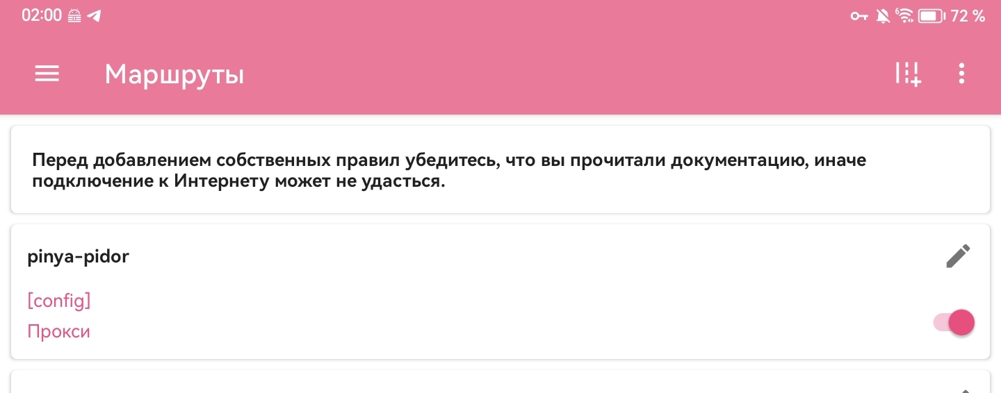 >>331836816 (OP) Нормибыдло не в теме, поясняю. nekobox единственный клиент, в котором есть добавление кастомных правил json: { "inbound": ["mixed-in", "socks-in"], "outbound": "block" } Только ваши васянские говноподписки могут не запуститься там по 2 причинам: 1. Барыга ахуел и включил менеджмент по устройствам, запрещающий нормальные клиенты без функции зондирования 2. xhttp транспорт не поддерживается и поддерживаться не будет. Можете дальше обтекать с эмуляторами и двойными песочницами