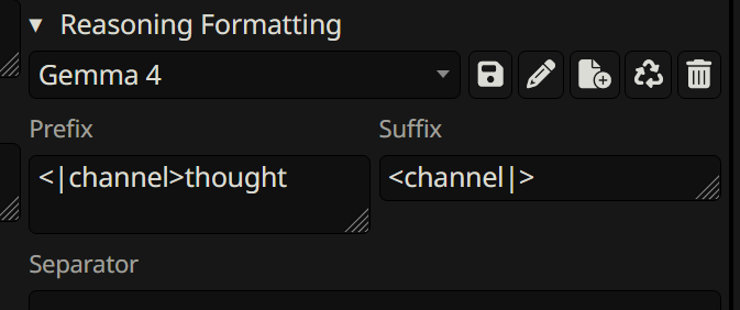 >>1583278 >усиление безопасности Гемма 4 это усиление безопасности? >>1583440 Ты ведь знаешь, что правильный выбор велосипедов не является гарантом прохождения гуглокапчи? >>1583483 Так она без джейла пишет секс, лол. Джейлбрейки не нужны, джейлбрейкоблядь не человек. >>1583522 >Как мы вообще пришли к тому что сравниваем на серьёзном ебало Примерно так же, как и первая ллама 7B выебала OPT на 175B. Примерно 4 года назад, да. >>1583577 >Пикрил - явно у меня что то не так с разметкой, ризонинг же не должен так выглядеть? Так ты добавь теги как на пикриле, чтобы парсился, и всё будет заебца. А на счёт падений вырубай контекст шифт и врубай SWA, иначе охуеешь от размера контекста. >>1583594 >3 дня назад Господи, как же всем на неё насрать. Гемму притащили чуть ли не раньше релиза.