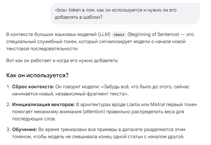 Tl;dr - на версиях Лламы где до конца разобрались с Геммой (начиная с b8748) и на обновленных квантах <bos> не нужен. До этого - нужен. Бекенды неправильно работали с шаблоном и сам шаблон внутри уже неактуальный, потому нужно было вручную парсить <bos> токен для Геммы.