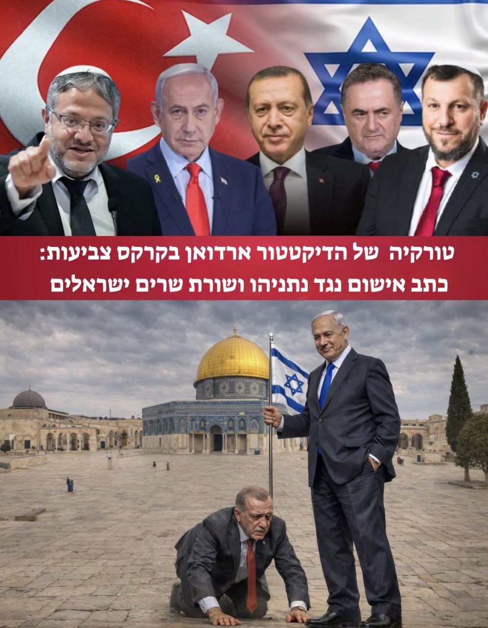 В своем посте Элияху разместил ИИ-изображение, на котором премьер-министр Биньямин Нетаньяху устанавливает израильский флаг на Храмовой горе в Иерусалиме, а Эрдоган склоняется к ногам Нетаньяху.