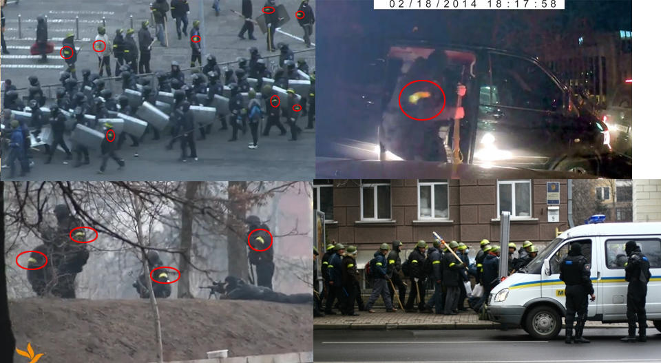 На видео можно увидеть людей одетых в форму Беркута, но с желтыми повязками. Они стреляют боевыми из АК. Можно увидеть и одного снайпера с очень интересной и явно западной винтовкой.