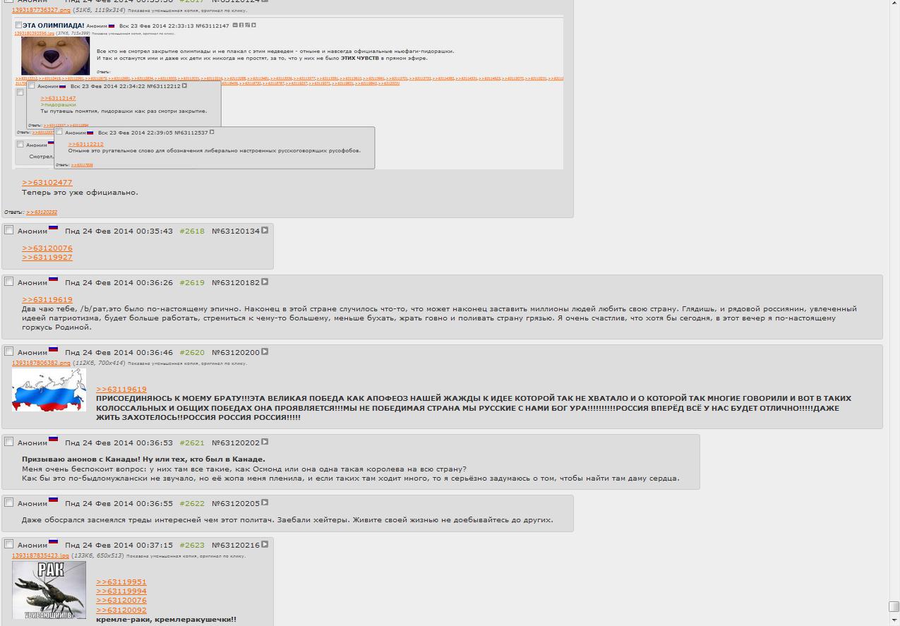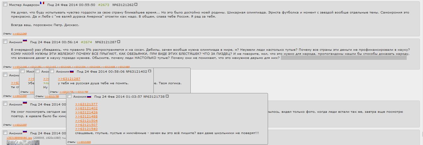 ОЛИМПИАДУШКУ ПОДЕБИЛИ! И ПЛЮВАТЬ, ЧТО РУБЛЬ УПАЛ ЗА МЕСЯЦ В 4/3 РАЗА, ПЛЮВАТЬ ЧТО ОБРАЗОВАНИЕ В ЖОПЕ, ЧТО КОРРУПЦИЯ ПОВСЮДУ, ЧТО БЕЗРАБОТИЦА И ПРЕСТУПНОСТЬ, ЧТО УРОВЕНЬ ЖИЗНИ КАК В ЗИМБАБВЕ, ГЛАВНОЕ, ЧТО ОЛИМПИАДУШКУ ПОДЕБИЛИ! КАК ДИДЫ ПОЧТИ! НУ, ТЕПЕРЬ МОЖНО И НАКАТИТЬ! АБУ, ТАЩИ ПУТИНКИ ЦЕСТЕРНУ, НАПОЛНЯЙ КРУЖКИ!