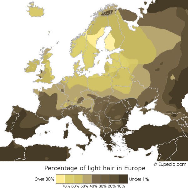 >>13285540 Эта карта от скандинавского антрополога (Лунд или Кун, точно не помню), который использовал данные советского антрополога Алексеева по территориям СССР. Но у Лунда/Куна была другая шкала определения светлости глаз/волос, не совпадающая со шкалой Алексеева.