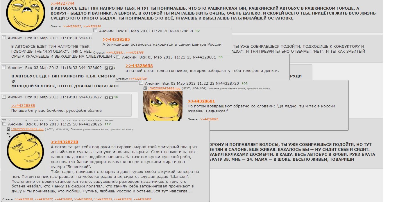 Почему-то двач не помнит этот тред. А для меня это был самый первый тред, который я открыл на дваче. Запомнил на всю жизнь. Зашёл бы сюда сейчас первый раз, думаю не остался бы.