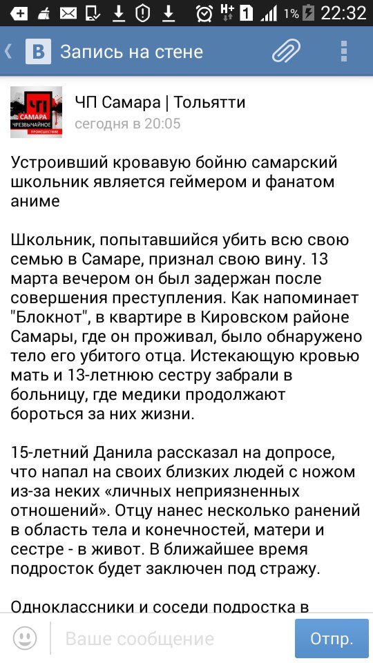 В моей школке девятиклассник порезал мамку и сеструху, а батю зарезал насмерть. Как же скучно я живу :с