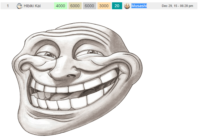 Когда я играл в KanColle и ходил разбирать корабли на ресурсы, хам из треда всё время как-бы невзначай крутился возле моего дока, и всё спрашивал, что ты там затих, почему тебя не слышно? Первый раз я не ответил, так он начал ломиться в док, и орать, что ты там молчишь, что с тобой? Начал материться и говорить, чтоб вообще из игры удалялся. Алсо, хам ругался, если я всех добытых девочек себе не оставляю, причём не просто полезных, а непосредственно по каждой имеющийся единице в игре, мотивируя это тем, что «по одной штуке каждой иметь обязан!», и сам потом мне говорил: «вот я, как новую девочку получу, сразу её у себя оставляю, и ты так делай!» Однажды я выбил кораблик в вылазке, и слышу, хам где-то у главного меню встал в отдалении, ну я в док зашёл, и на кнопу «разобрать» мышку навожу, а там щель очень широкая снизу между кнопками, ну я в щель и смотрю, а там хам на карачиках сидит и в щель смотрит, и мне говорит: ты чё? ебанутый? чё ты там делаешь? Хам, кстати, всё время слоты какие-то покупает, чтобы девочек можно было больше иметь, донатит по 5 раз в день, а потом говорит, что тут сотни часов и денег тратят, и ещё ругается он. Пиздец короче! Реальная история, я адмирал.